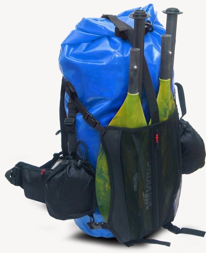 De packraft kan zowel in als onderaan de rugzak gedragen worden.